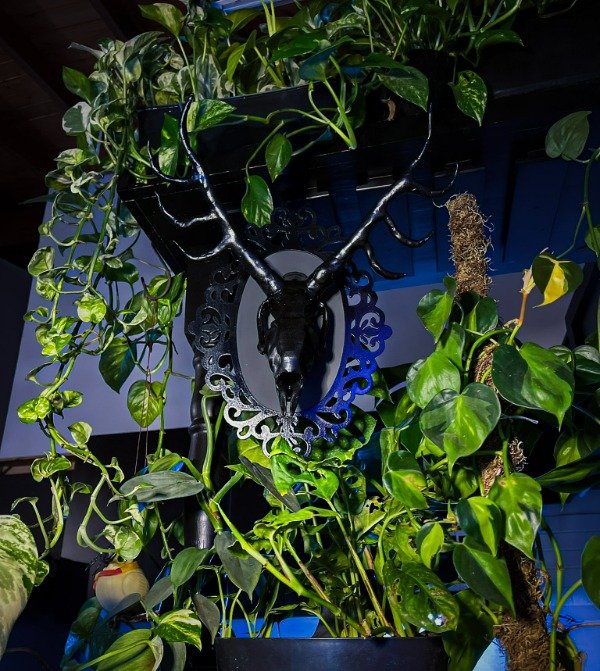 Diseñado y elaborado en MDF de 12 mm de espesor, presenta una silueta de cráneo de ciervo impresa en 3D PLA, coronada por una cornamenta esculpida en masilla, enmarcada en un adorno gótico de líneas ornamentales. Su color negro profundo resalta con la luz, proyectando sombras que transforman cualquier espacio en un altar estético.