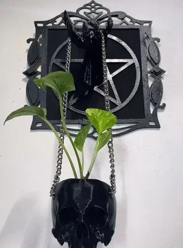 Diseño con pentagrama y maceta colgante en forma de cráneo.